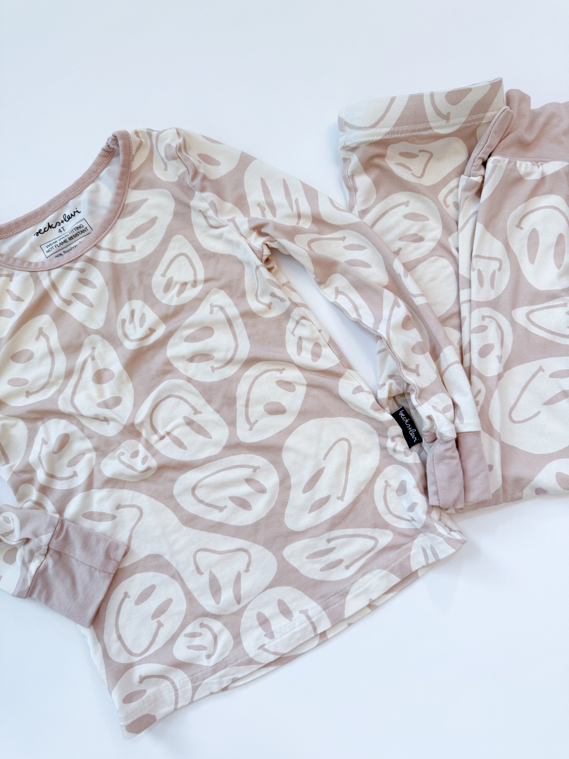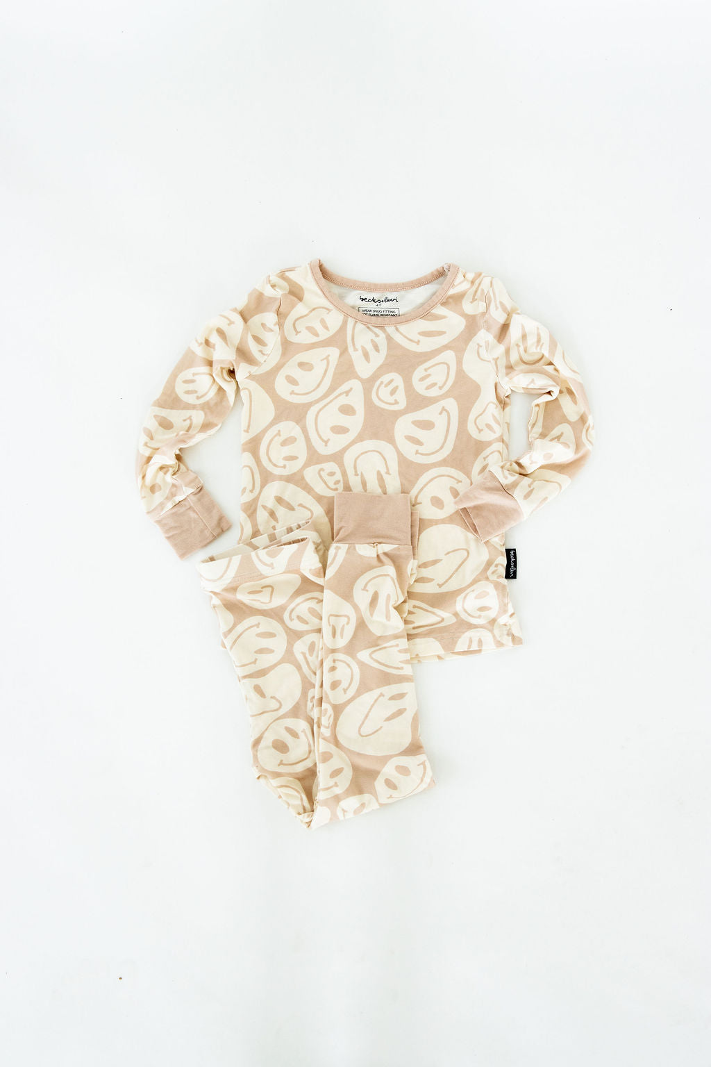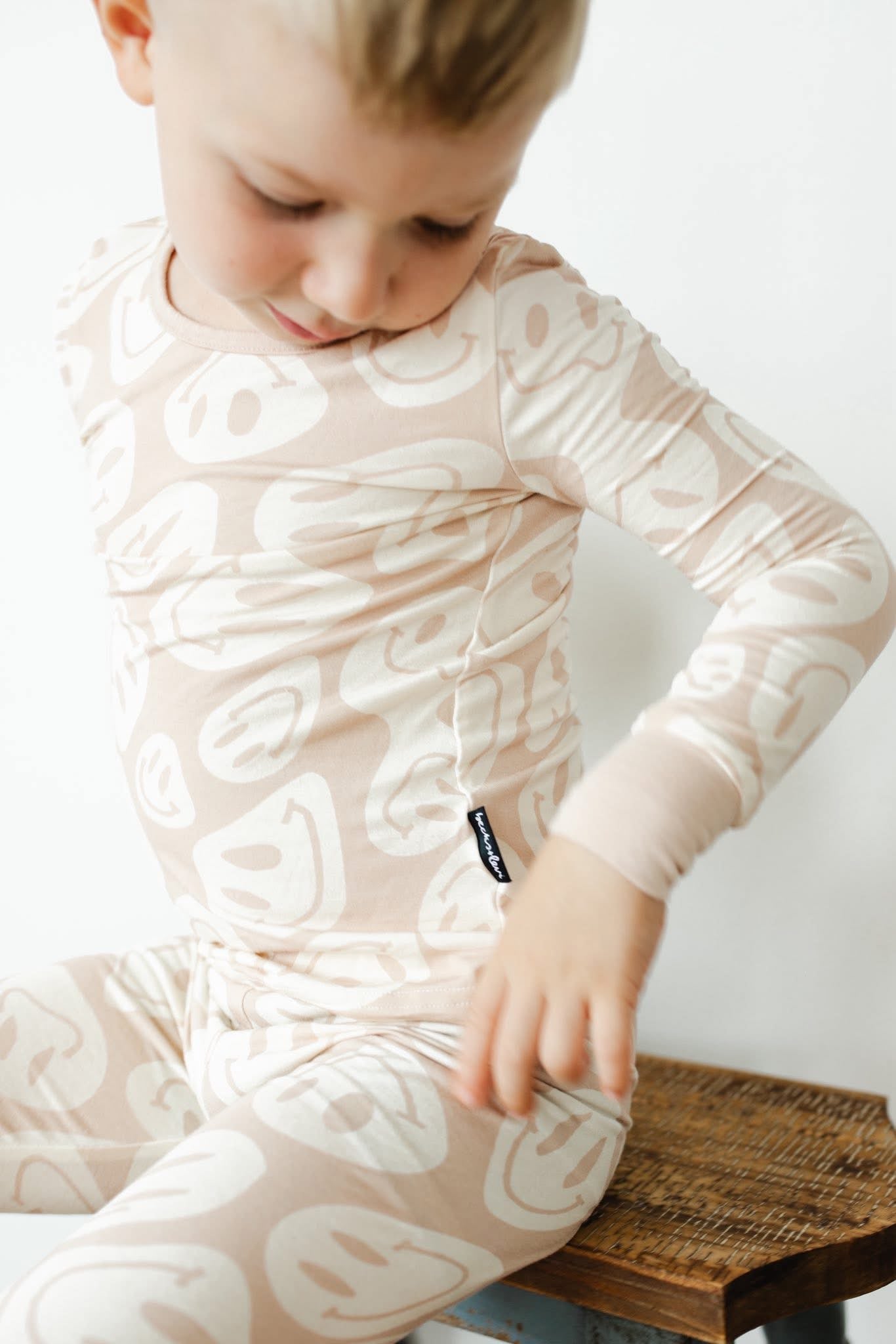 Crafted from ultra-soft, premium bamboo, these cozy pajamas are designed for both comfort and durability—perfect for sleep or play. Our two-piece set includes a long-sleeve top with an elastic-waisted pants bottom. Our Becks print is a one-of-a-kind pattern that features a tan color with cream colored warped smiley faces.