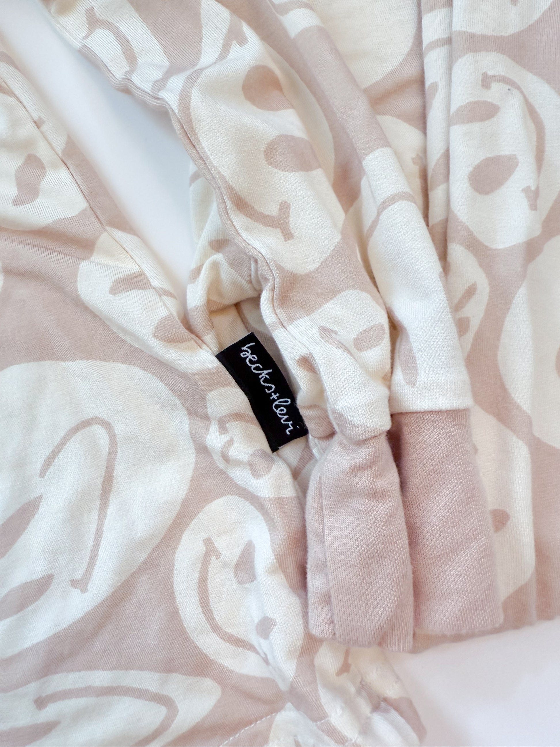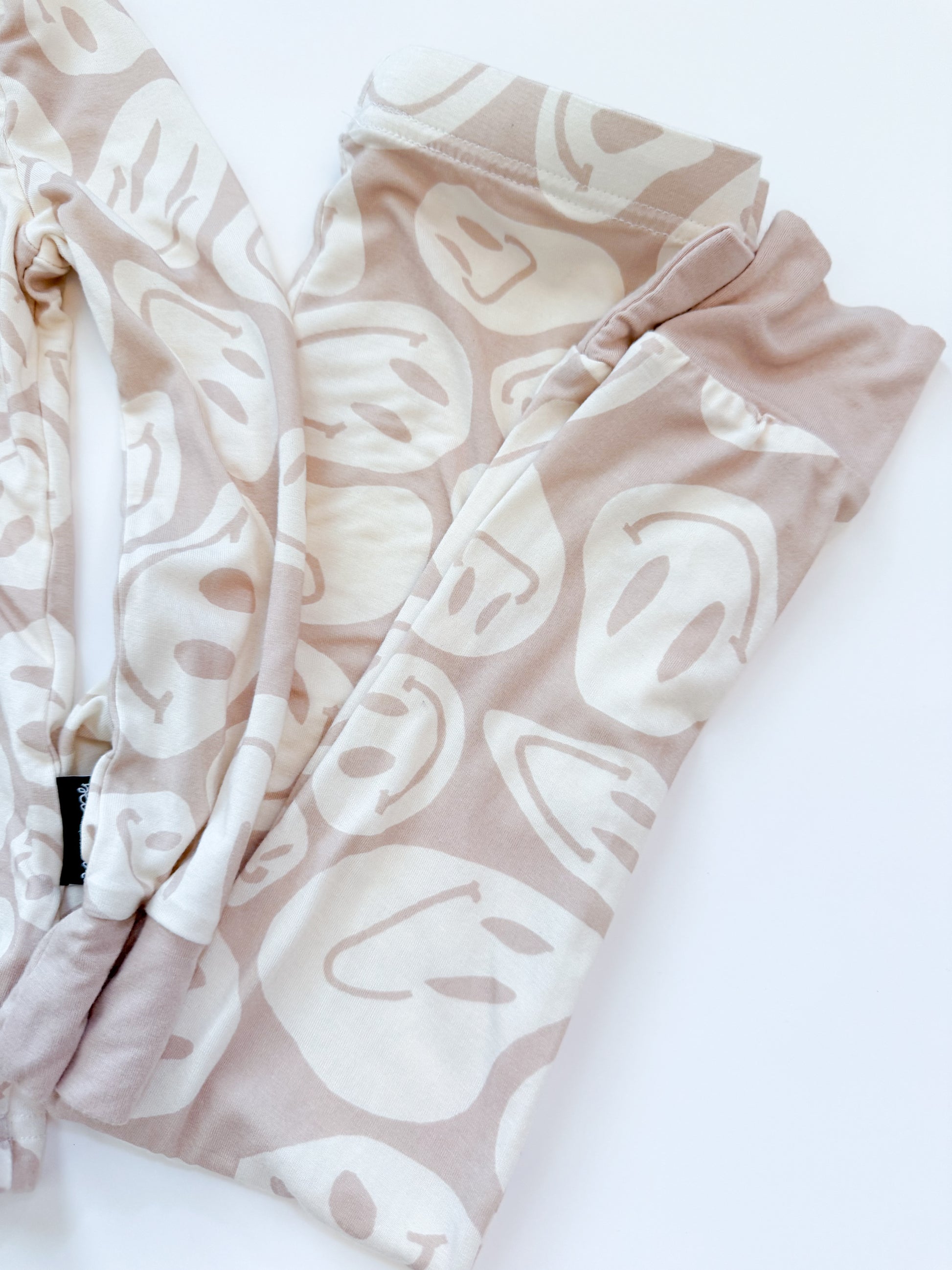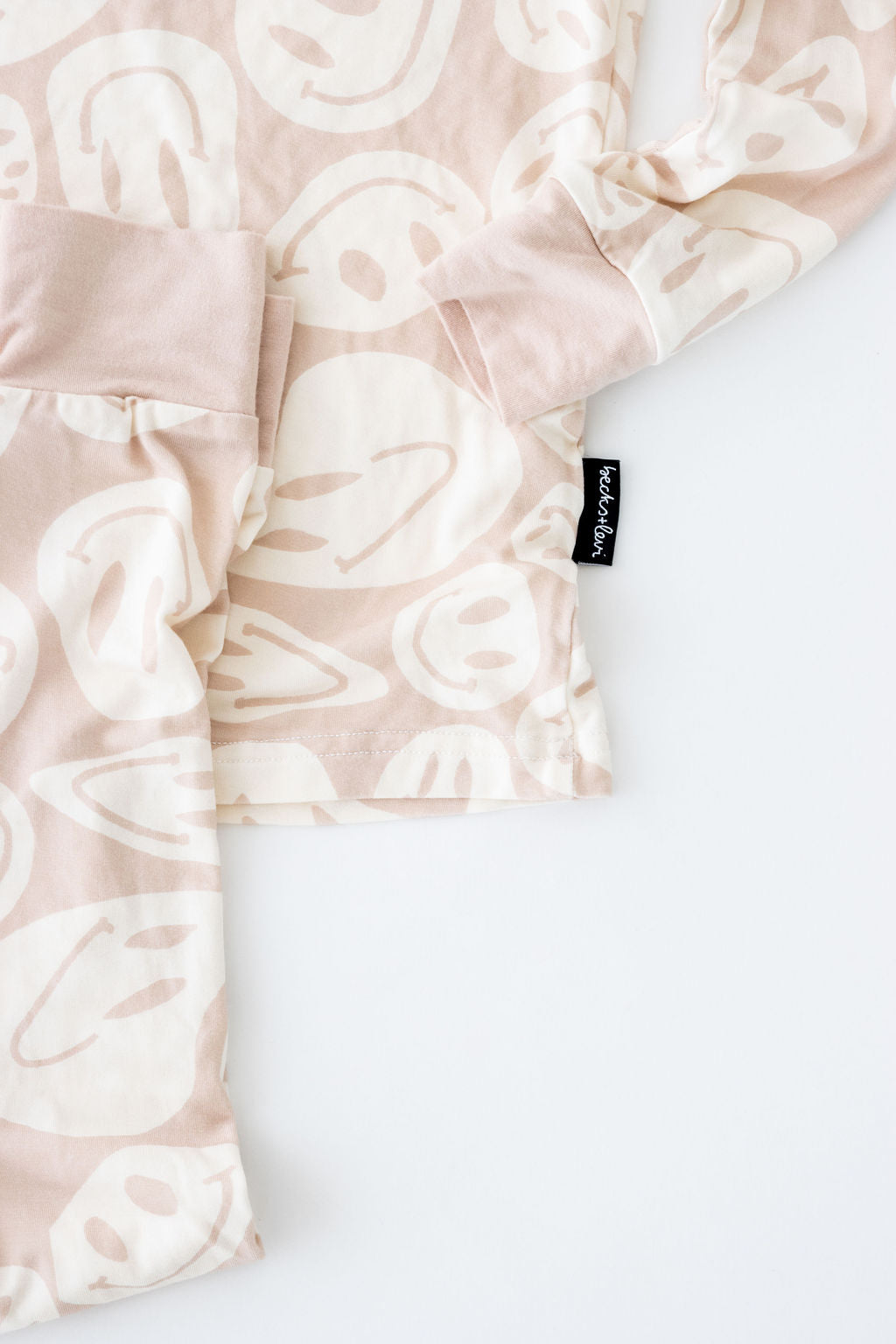 Crafted from ultra-soft, premium bamboo, these cozy pajamas are designed for both comfort and durability—perfect for sleep or play. Our two-piece set includes a long-sleeve top with an elastic-waisted pants bottom. Our Becks print is a one-of-a-kind pattern that features a tan color with cream colored warped smiley faces.