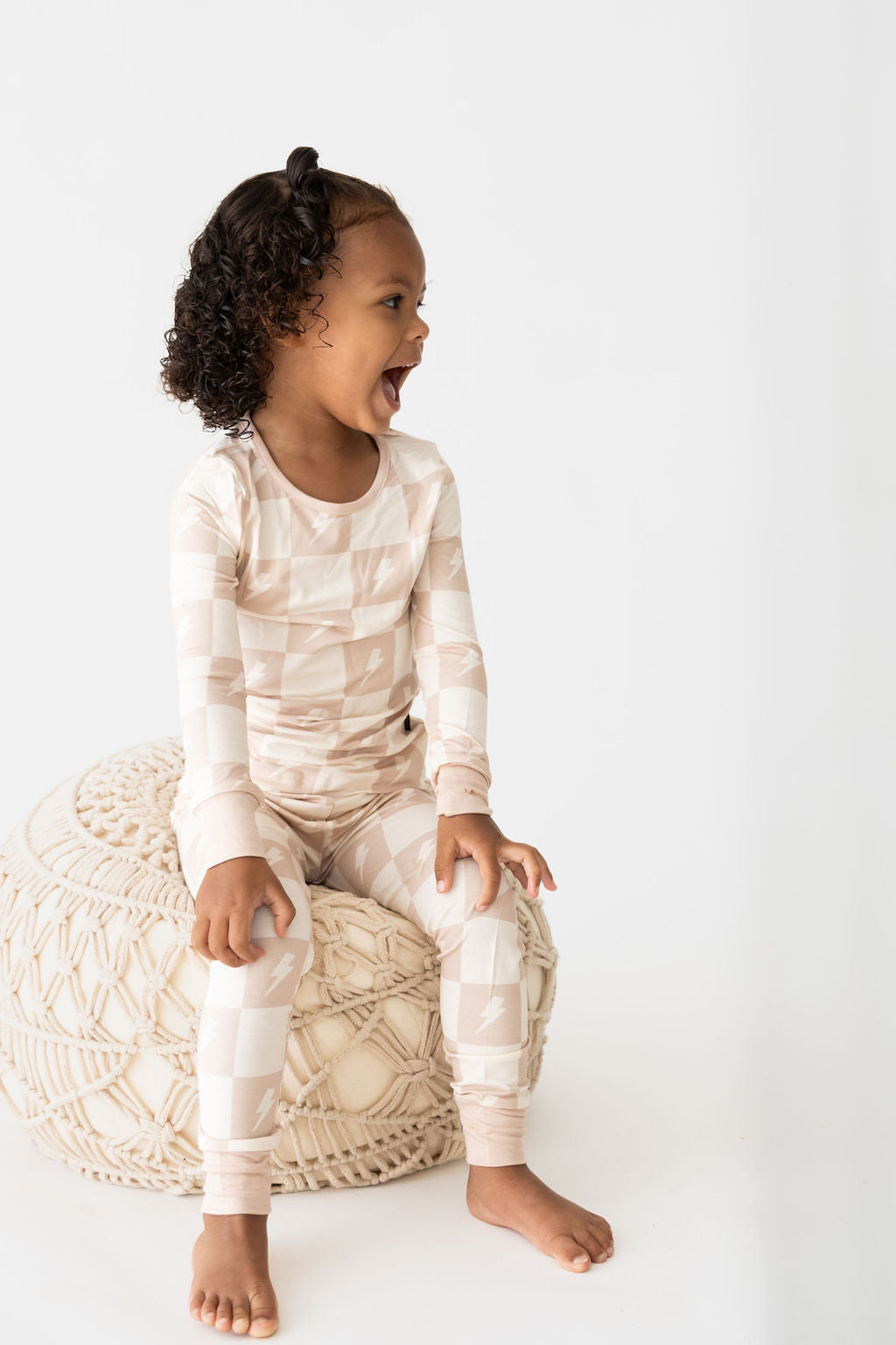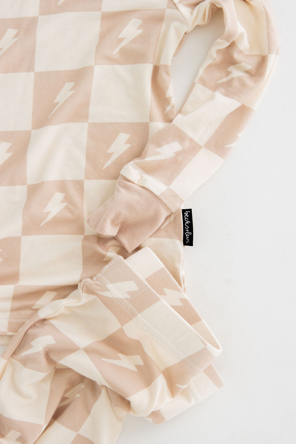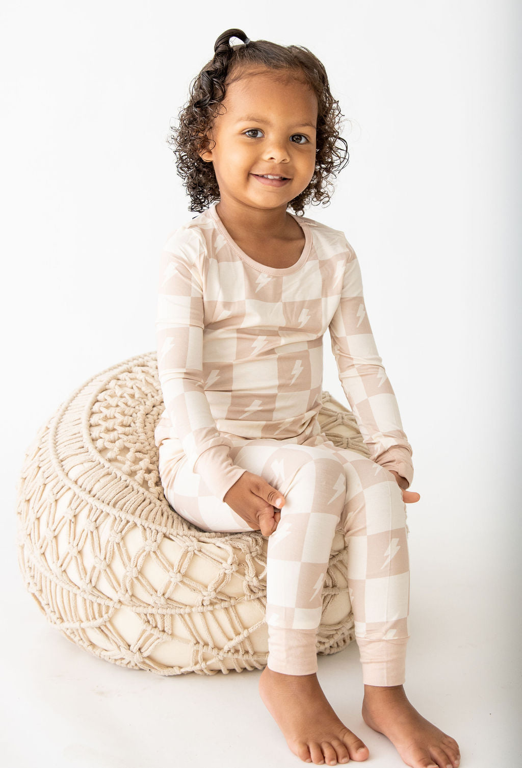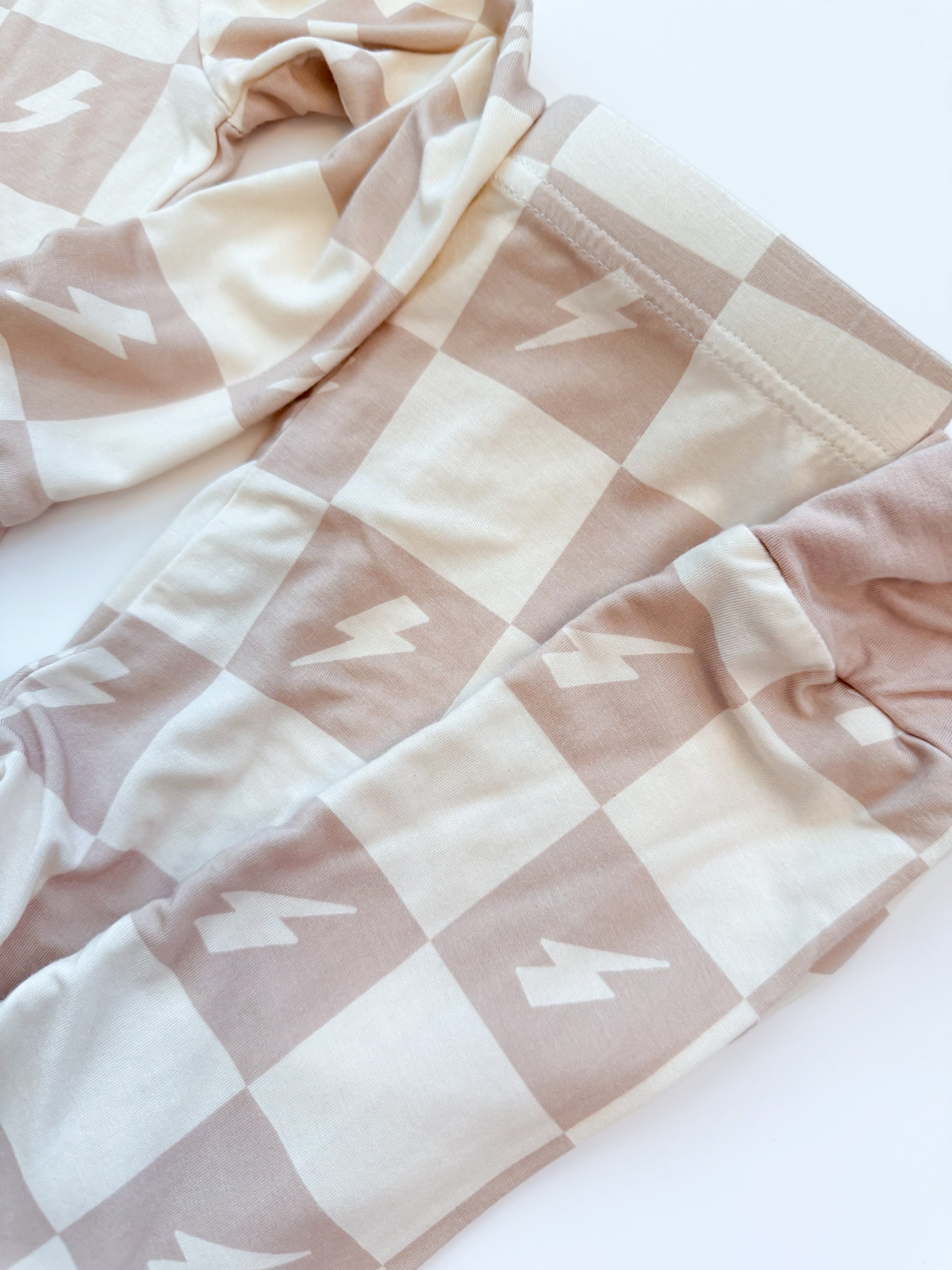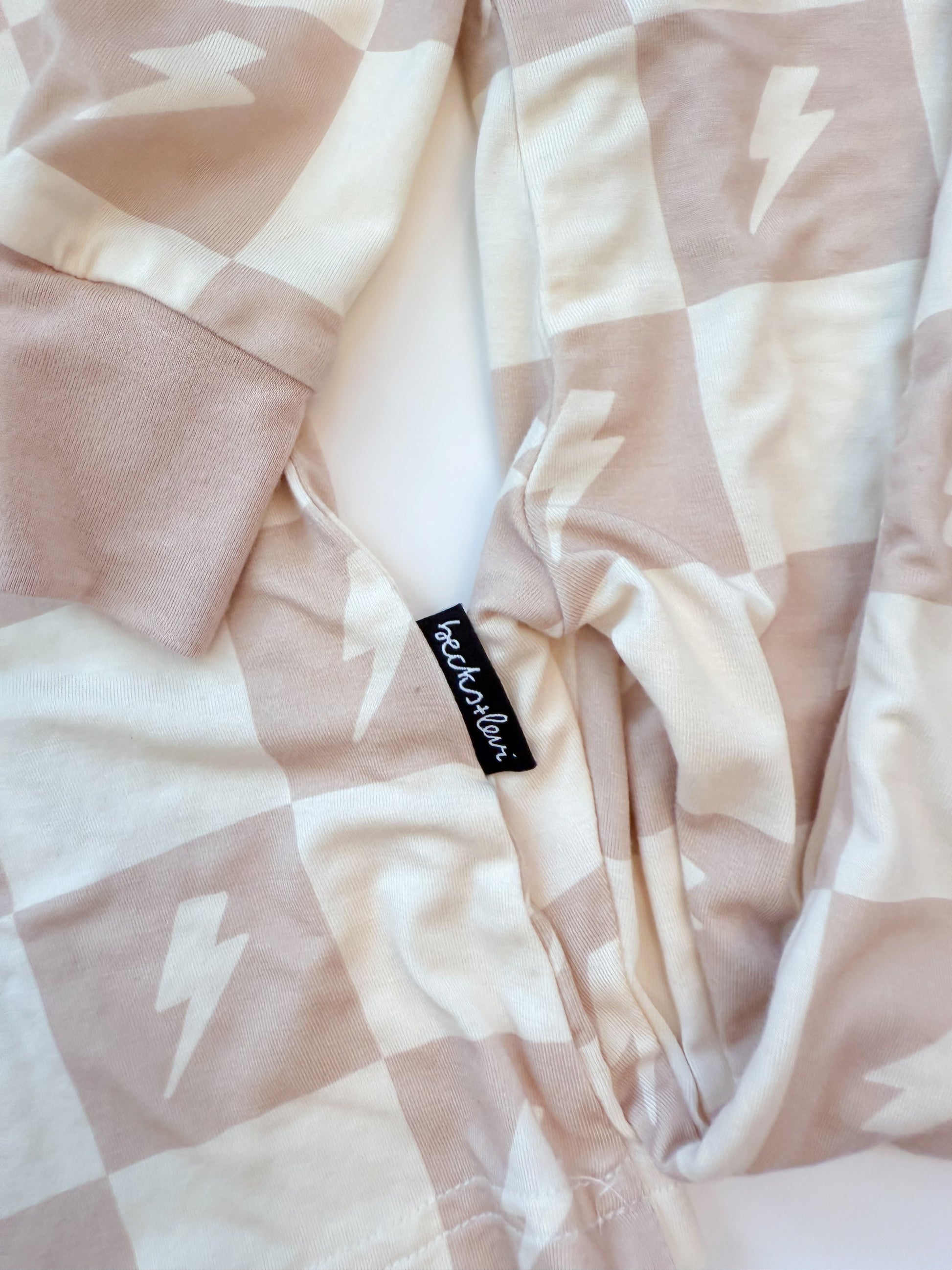 Crafted from ultra-soft, premium bamboo, these cozy pajamas are designed for both comfort and durability—perfect for sleep or play. Our two-piece set includes a long-sleeve top with an elastic-waisted pants bottom. This Levi print features a tan and cream checkered print with cream lightning bolts. It's the perfect gender-neutral design for all of your little ones!