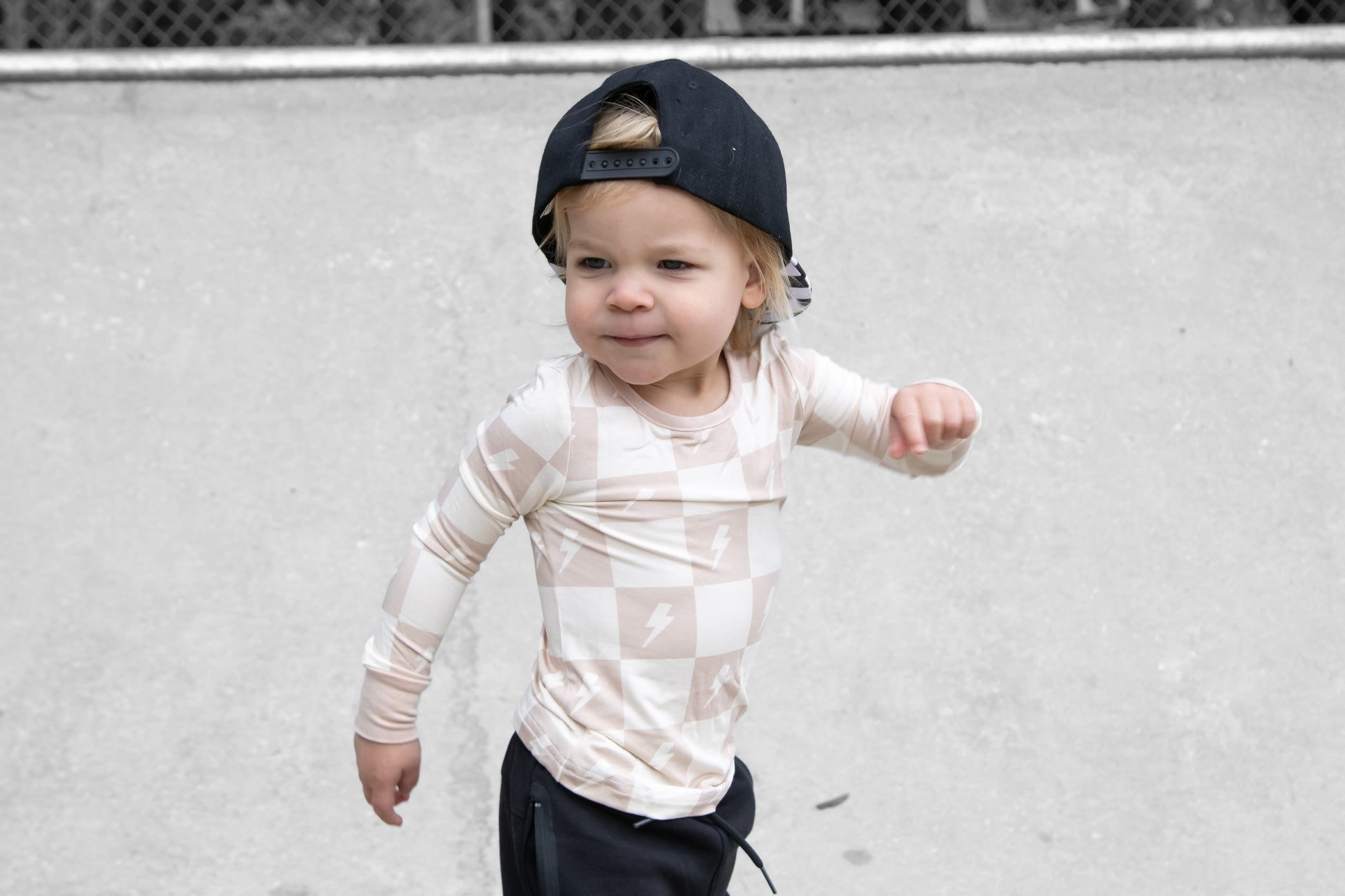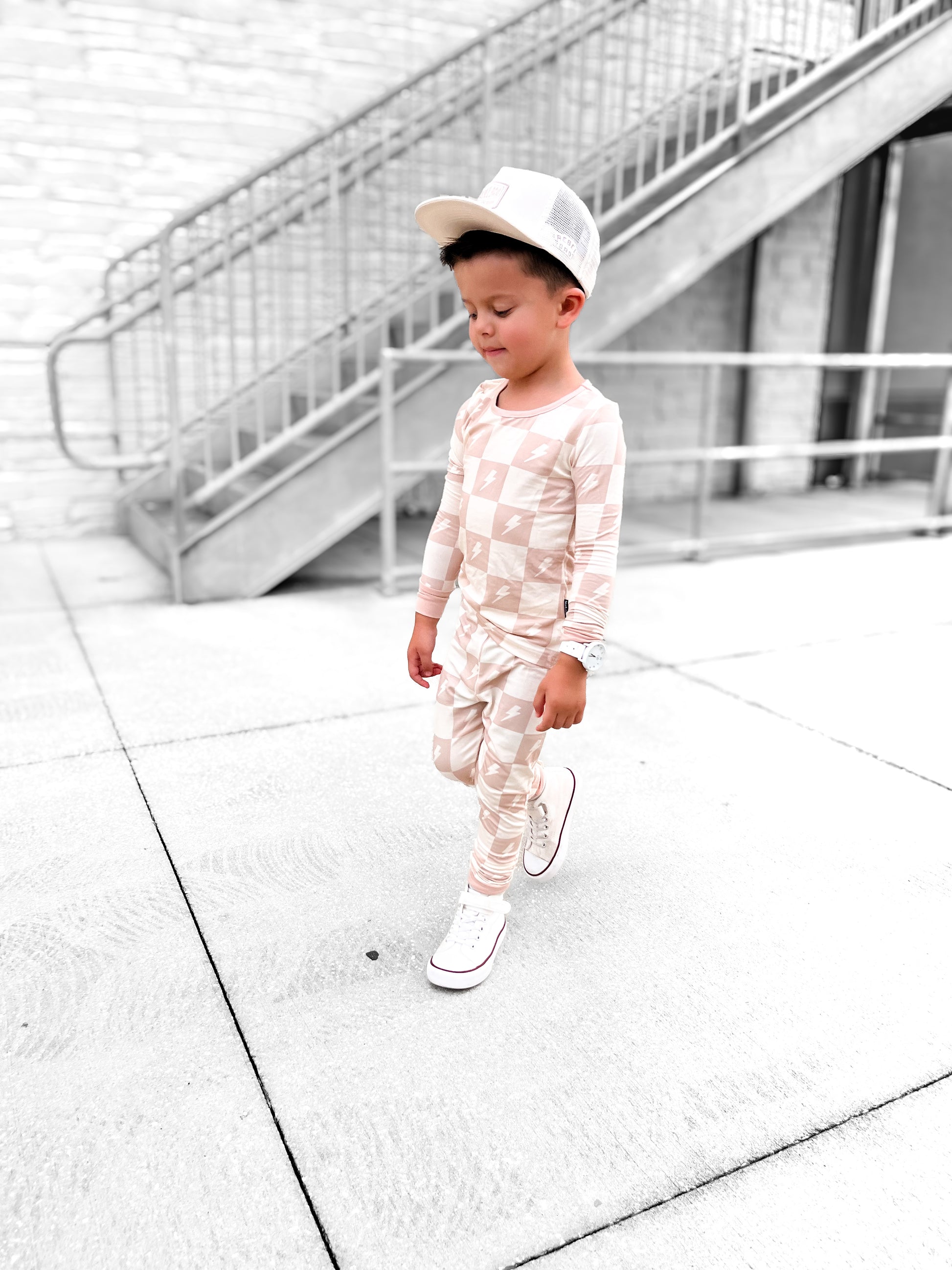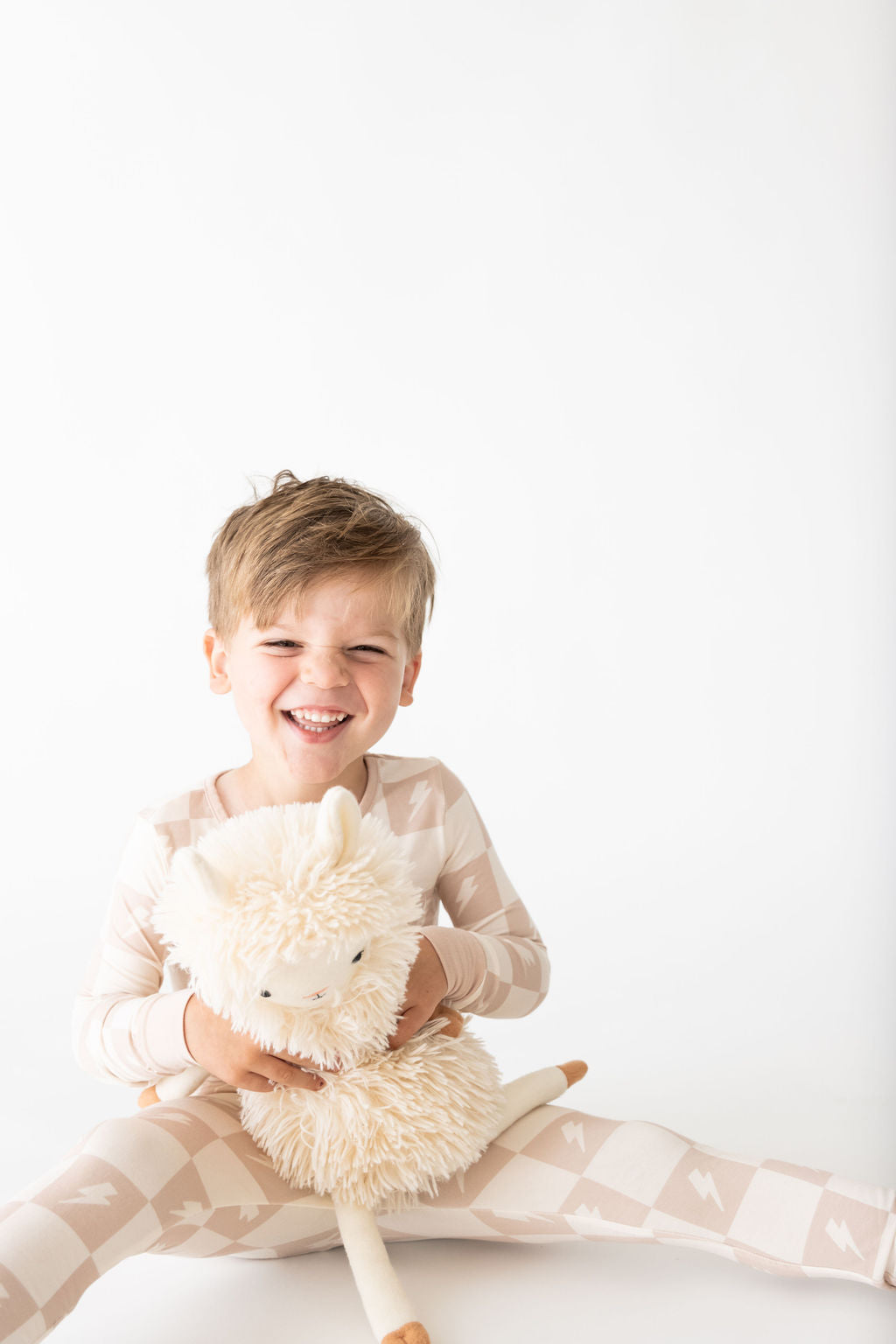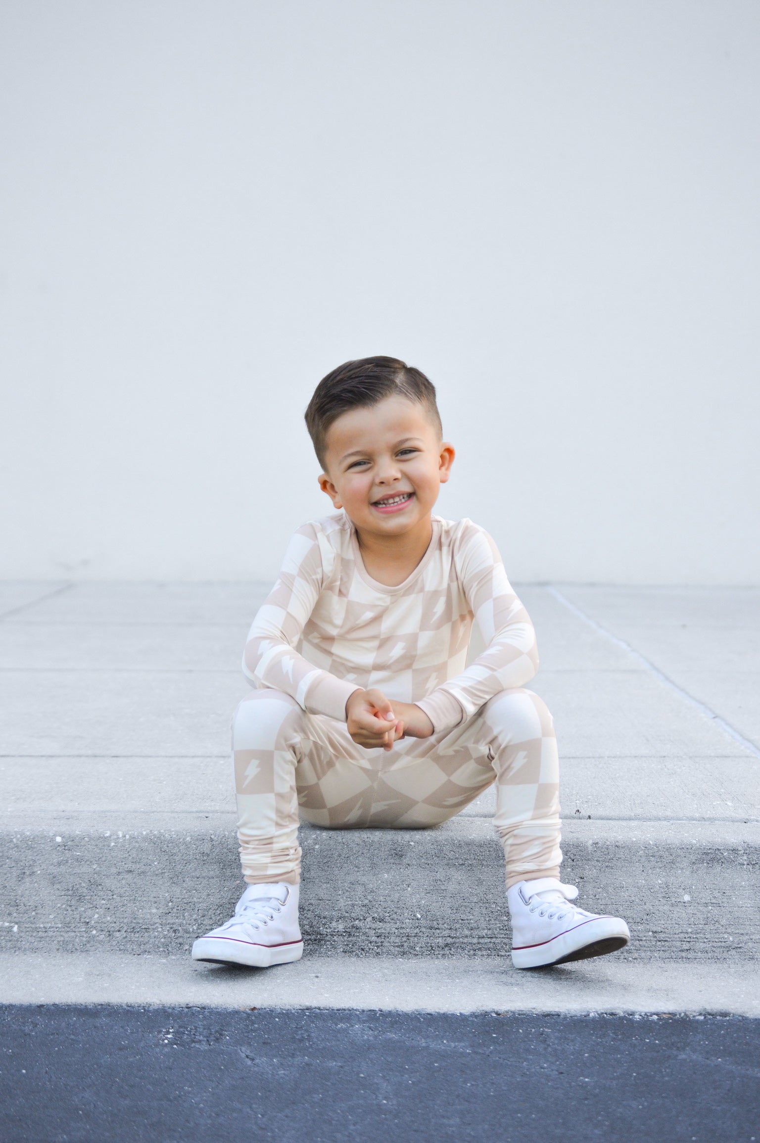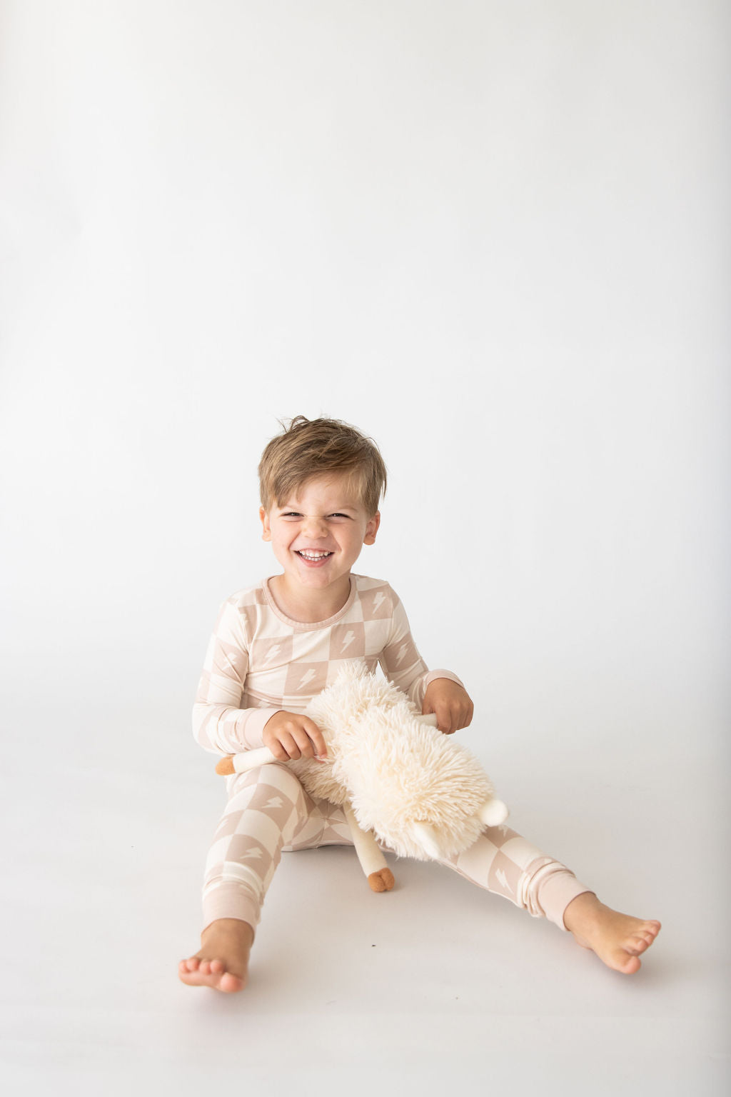Crafted from ultra-soft, premium bamboo, these cozy pajamas are designed for both comfort and durability—perfect for sleep or play. Our two-piece set includes a long-sleeve top with an elastic-waisted pants bottom. This Levi print features a tan and cream checkered print with cream lightning bolts. It's the perfect gender-neutral design for all of your little ones!