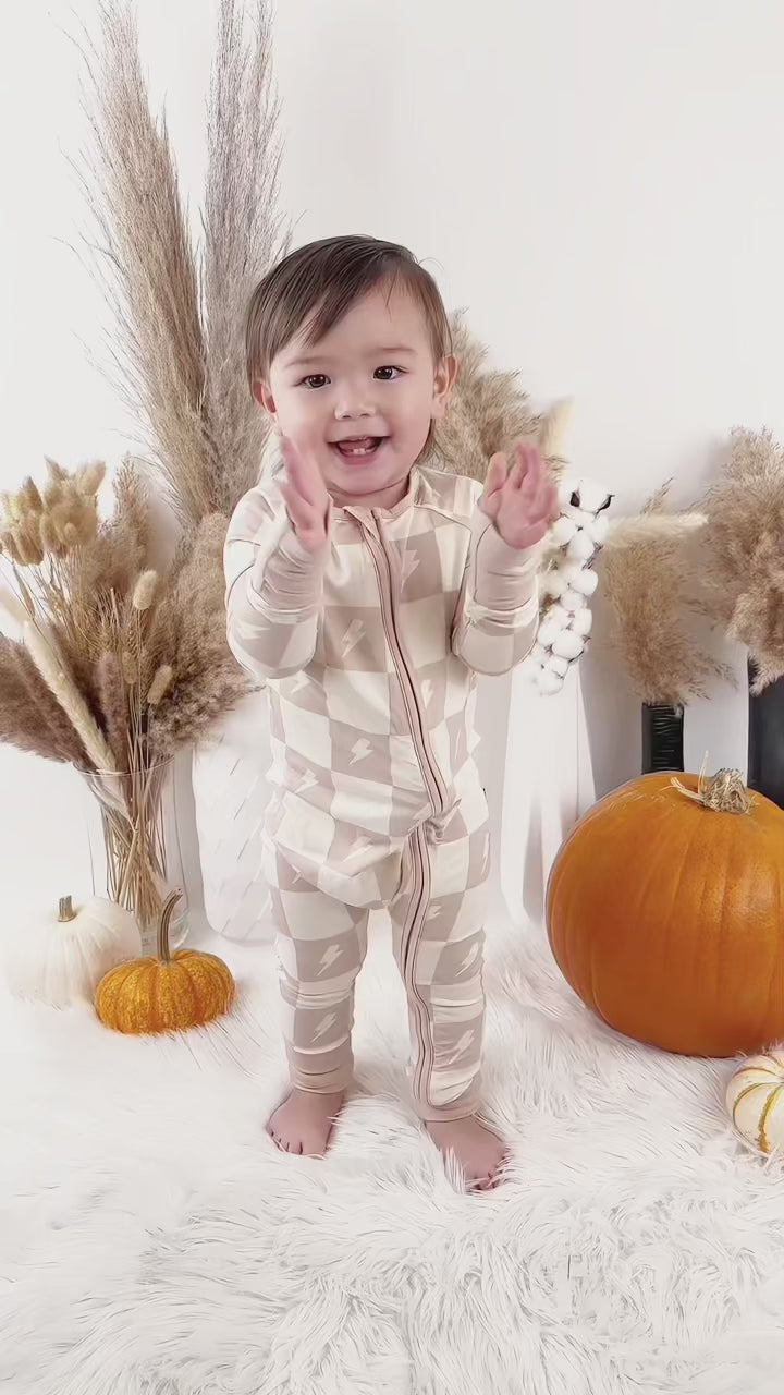 This classic lightning bolt, checkered pattern is the perfect gender neutral look for your little guy or gal. This pattern features a light tan checkered pattern with a cream bolt design.
